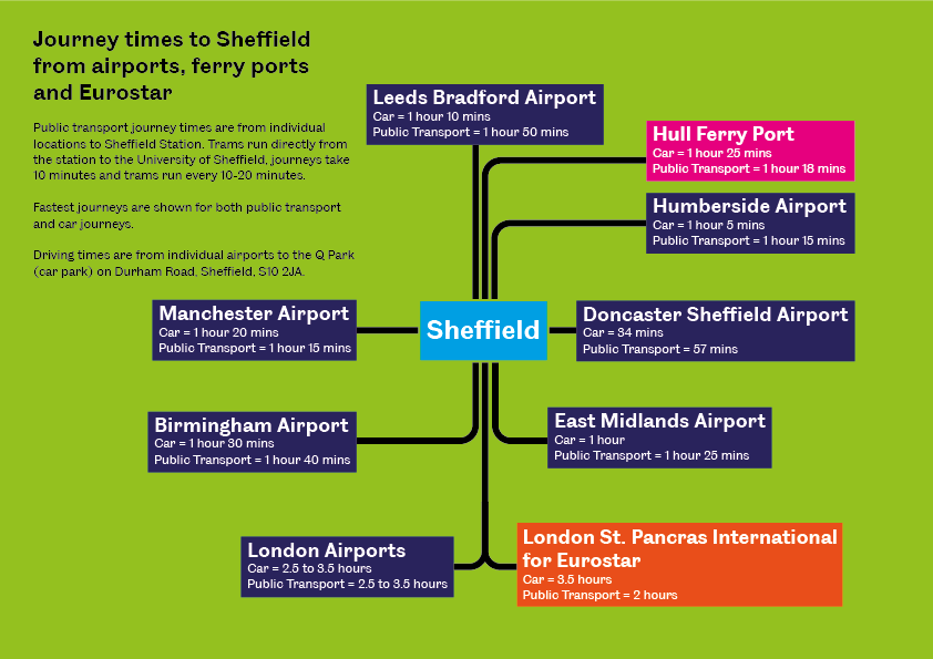 Public transport journey times are from individual locations to Sheffield Station. Trams run directly from University of Sheffield to the Station, journeys take around 10 minutes and the trams run every 10–20 minutes.